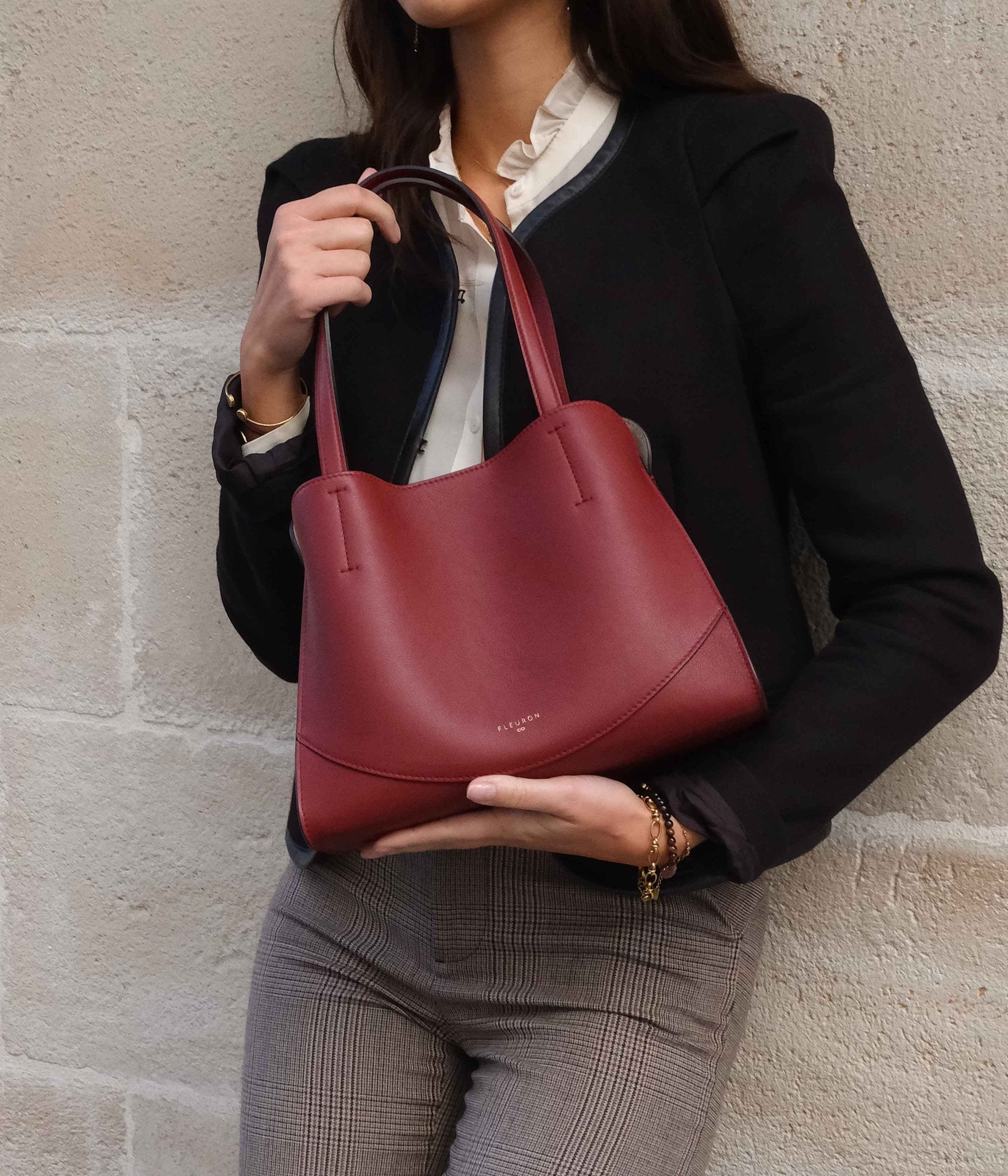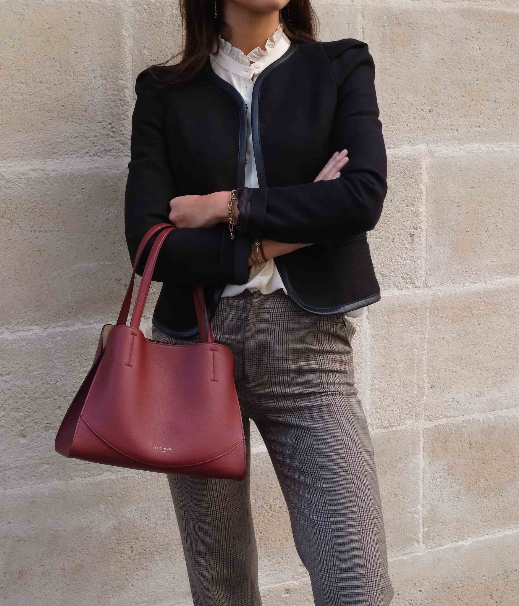 Its Bordeaux shade, timeless and refined, pairs beautifully with neutral tones like beige, pearl grey, or ivory, while also complementing deeper hues such as navy, camel, or forest green for a sophisticated, modern look.
