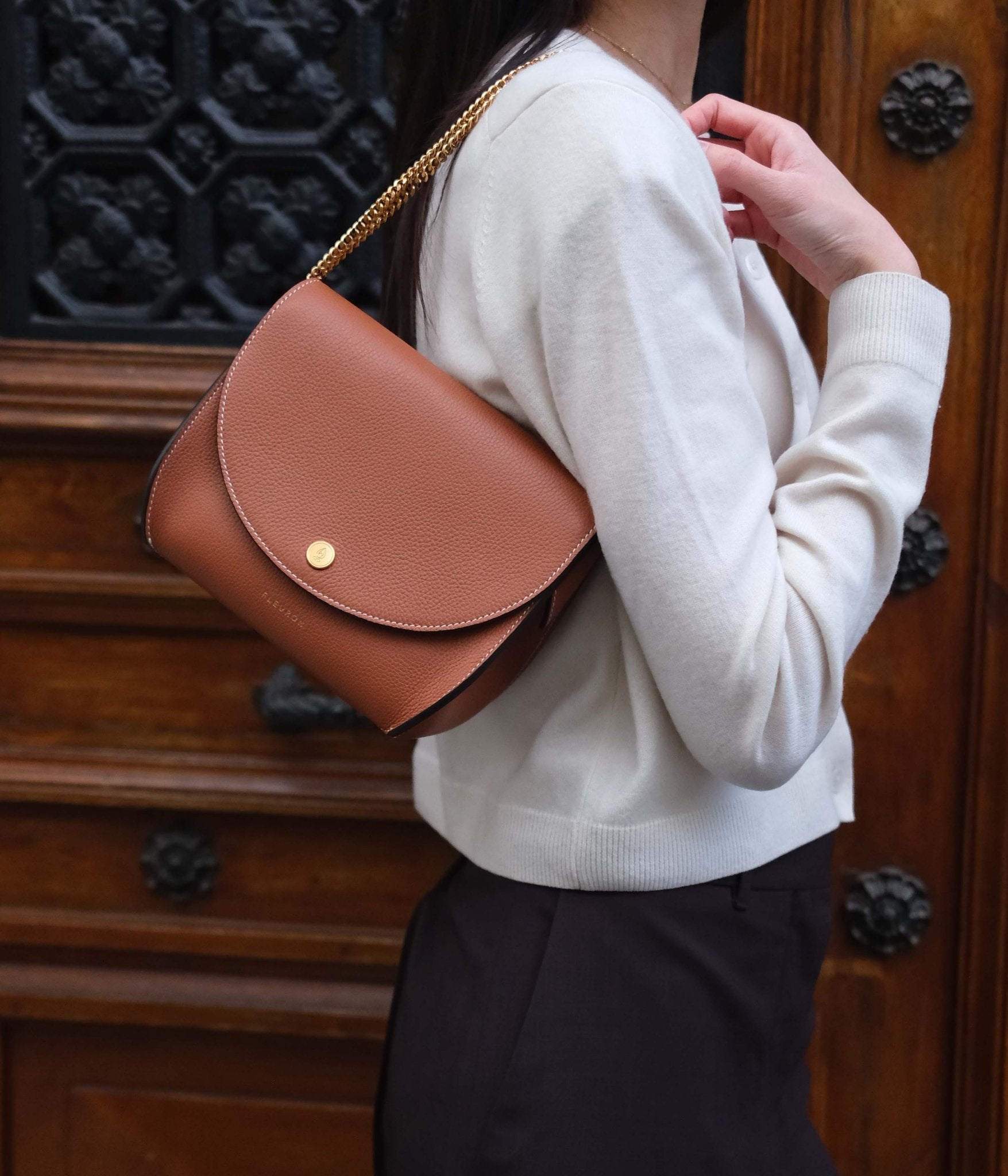 Made from carefully selected grained calf leather, it stands out for its refined texture and ideal durability for daily use. Subtle gold-tone accents highlight the depth of the Caramel shade—a rich, inviting color that pairs beautifully with light tones like ecru, sandy beige, or linen for a soft, balanced look. For a more defined contrast, style it with deeper hues like chocolate brown, pine green, or navy blue to bring out the warmth and richness of this versatile color.