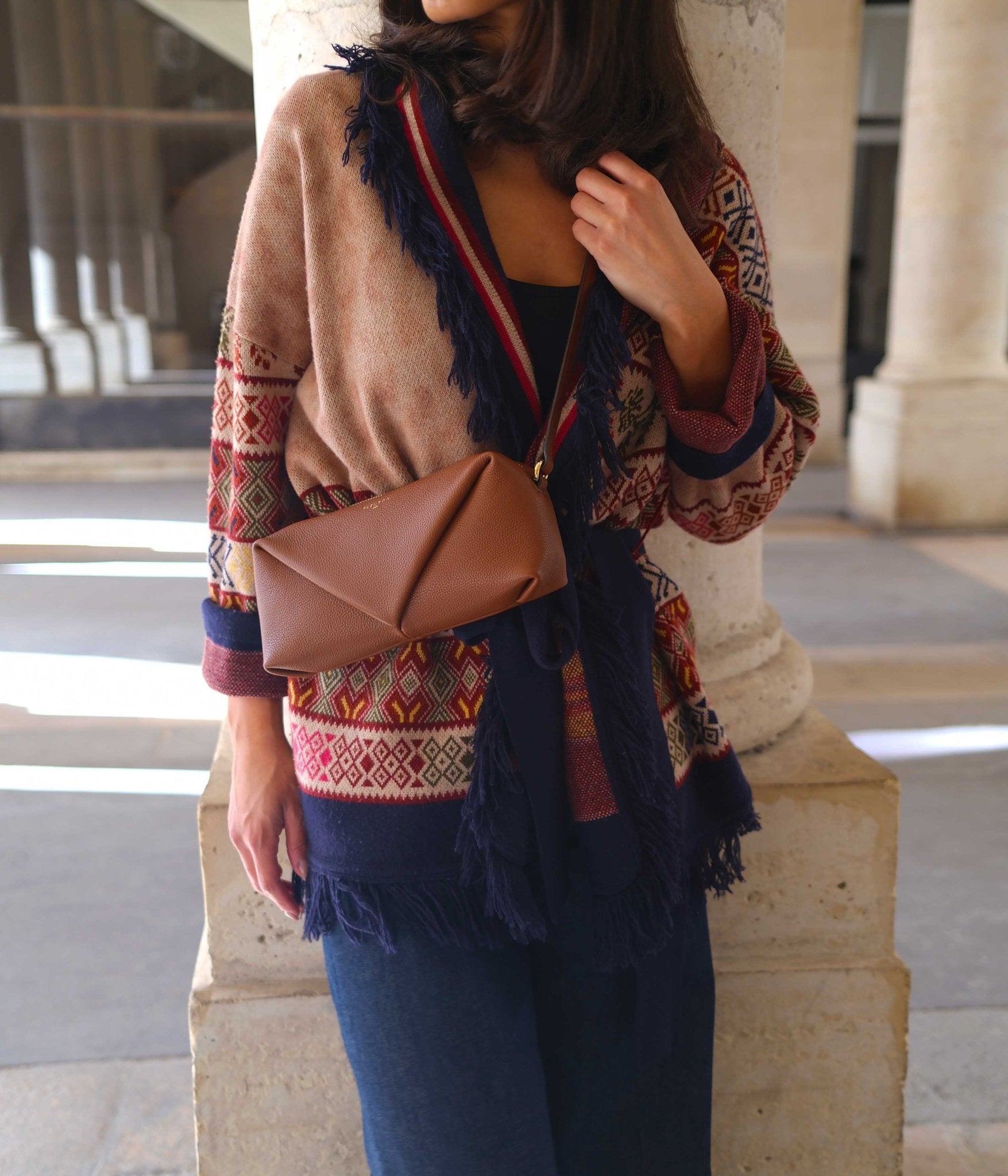 Its adjustable strap offers multiple carrying options : as a clutch, over the shoulder, or as a short crossbody depending on the occasion. The Trinity in Brown pairs beautifully with warm tones like beige, camel, or terracotta for a soft and harmonious look. It also creates striking contrasts with bolder shades like navy blue, charcoal grey, or emerald green for a more sophisticated and confident silhouette.