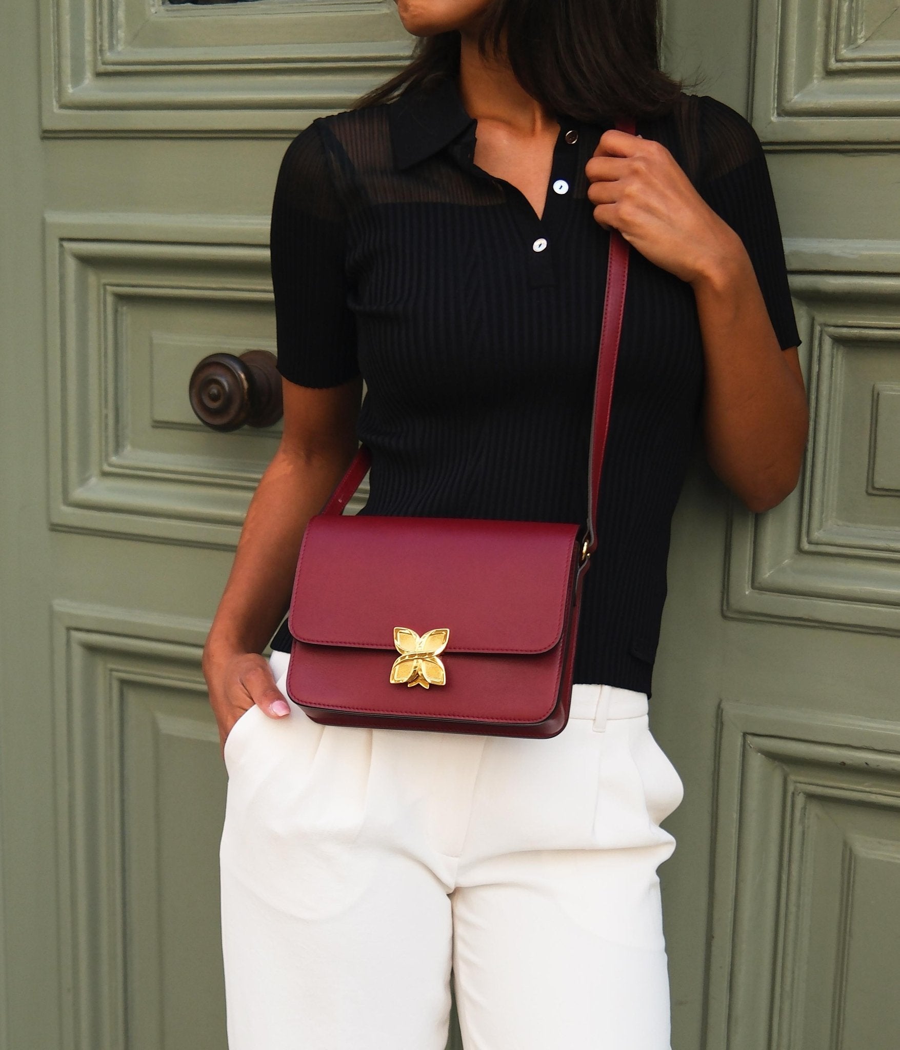 For a look that’s both warm and daring, pair the Hortensia Cerise with golden or copper accents that highlight the richness of its color. It also pairs beautifully with shades of brown, camel, or deep green, creating a subtle contrast and an elegant combination for any season.
